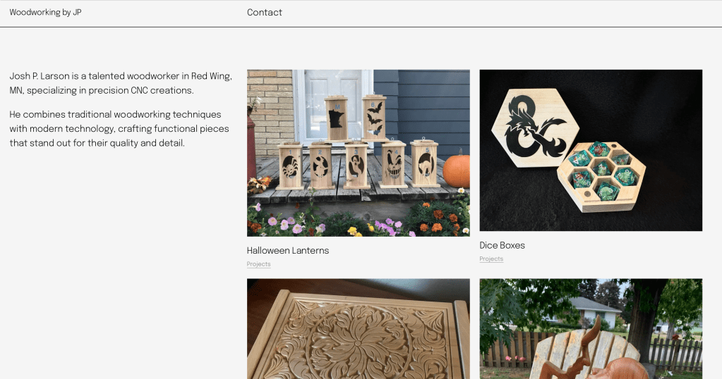 This project was created for Josh P. Larson, a woodworker based in Red Wing, MN. Having admired Josh’s craftsmanship for many years, I wanted this website to serve as a platform to highlight his exceptional artistry and spread the word about his work.