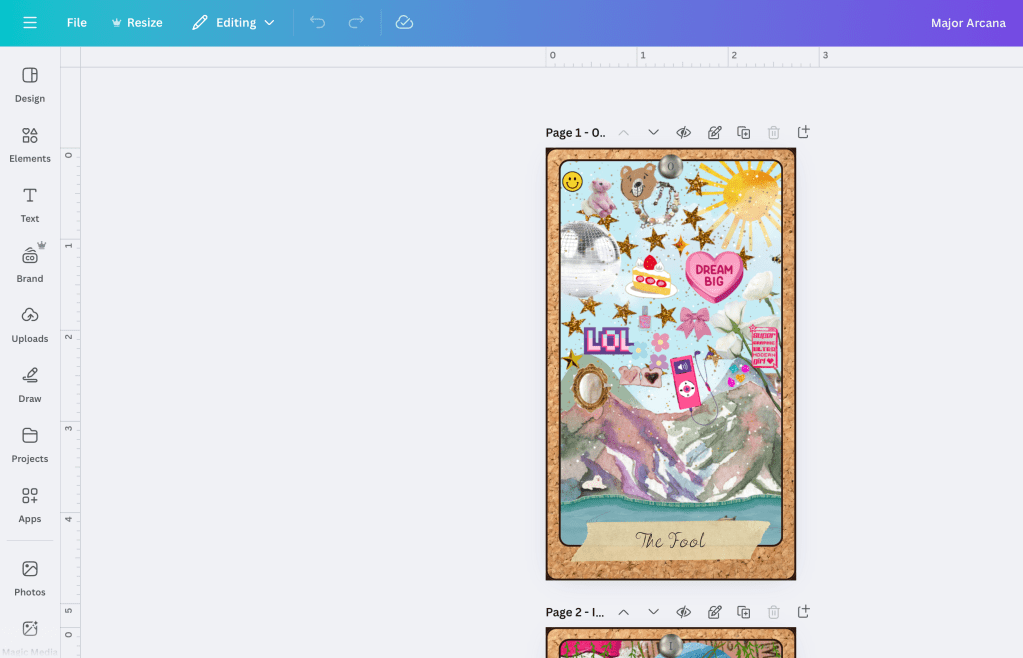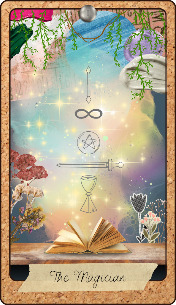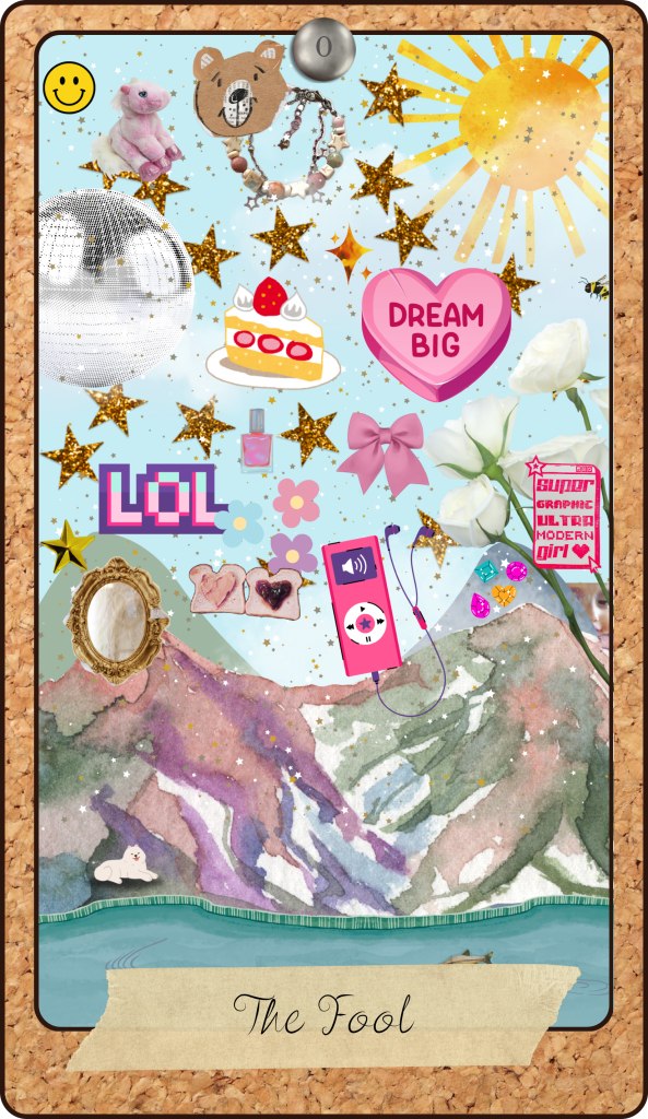 The design process has been both exciting and challenging. I’m experimenting with different artistic techniques to capture the layered, scrapbook-like quality that defined so much of my childhood media. I want each card to feel unique while still maintaining the cohesion necessary for a complete deck. So far, I’ve drafted a few Major Arcana cards, including The Fool and The High Priestess.