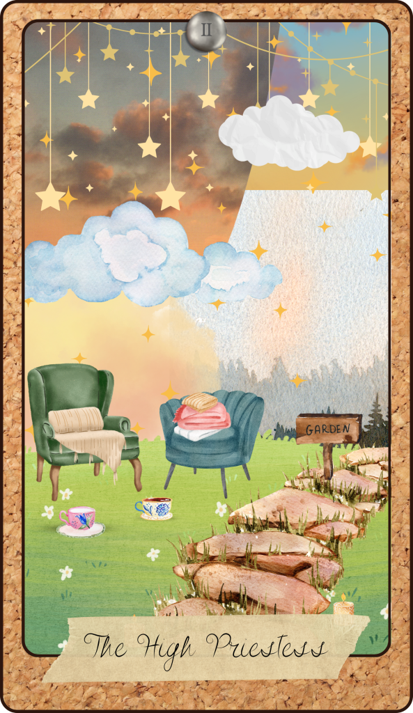 The High Priestess, on the other hand, is welcoming, represented by a quiet scene of two chairs and a cup of tea—a symbol of invitation, mystery, and contemplation. It hints at knowledge and wisdom, but only if you’re willing to sit down, slow down, and listen to what’s hidden in the silence.