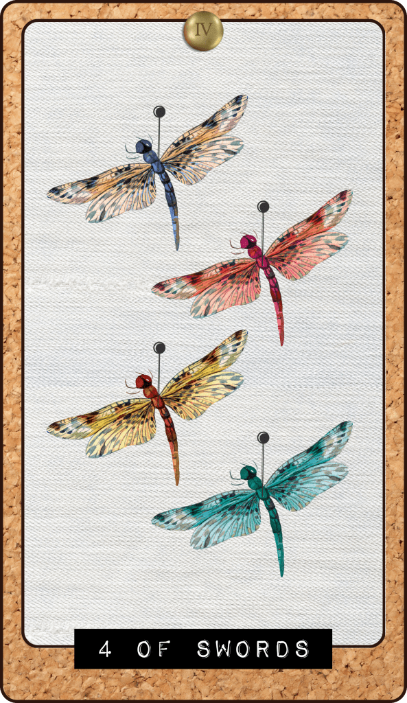 Much of my inspiration came from the electronics, makeup, and everyday objects that defined my childhood, especially those tied to significant people in my life. The Four of Swords, for instance, is a tribute to my grandmother, who adored dragonflies.