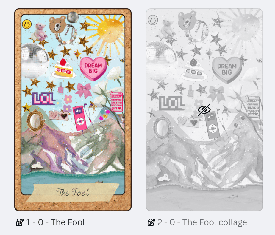 Each card reinterprets familiar archetypes, offering new layers of meaning: The Fool is a curious dreamer, stepping into a world of glitter and plastic, full of potential but unaware of what lies ahead.